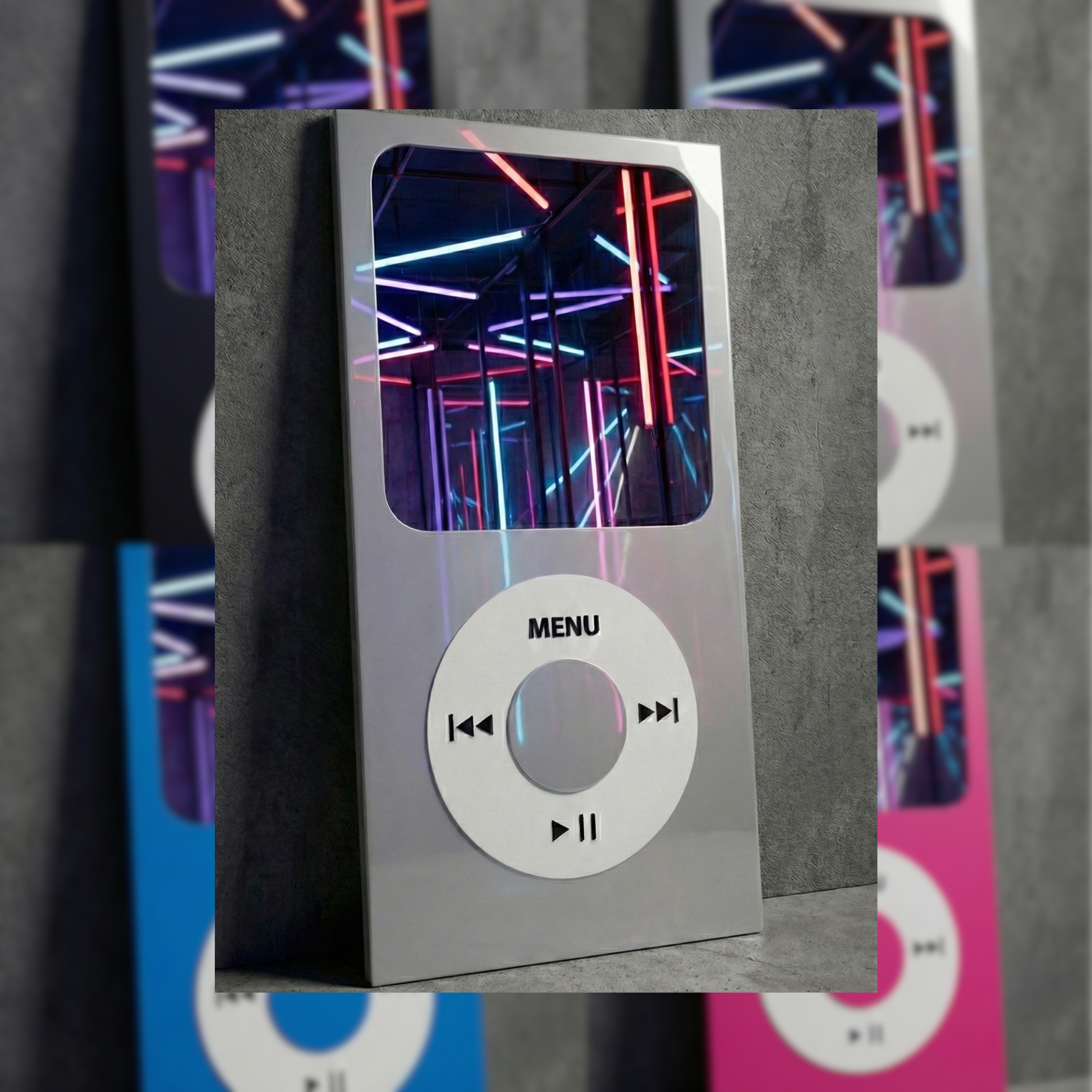 Before streaming, there was the scroll. This mirror captures the soul of the MP3 era, framing your reflection within the iconic interface that put 1,000 songs in your pocket.
